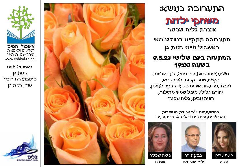 ביום שלישי 9.5 תושק בגלריית אשכול פיס רמת גן תערוכה (אוצרת: גליה שכטר) העוסקת בעולם הילדות שמהווה מקור לגעגוע ולשורשים שעיצבו את אישיותנו. בתערוכה יציגו