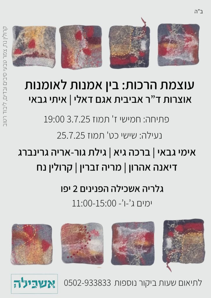 התערוכה "עוצמת הרכות: בין אמנות לאומנות" (אוצרות: ד"ר אביבית אגם דאלי ואיתי גבאי), שתושק ביום חמישי 3.7.25 בשעה 19:00 בגלריית אשכילה, רחוב הפנינים 2 ביפו, מאגדת עבודות של שש אמניות שהמשותף לכולן הוא יצירה ייחודית בטקסטיל