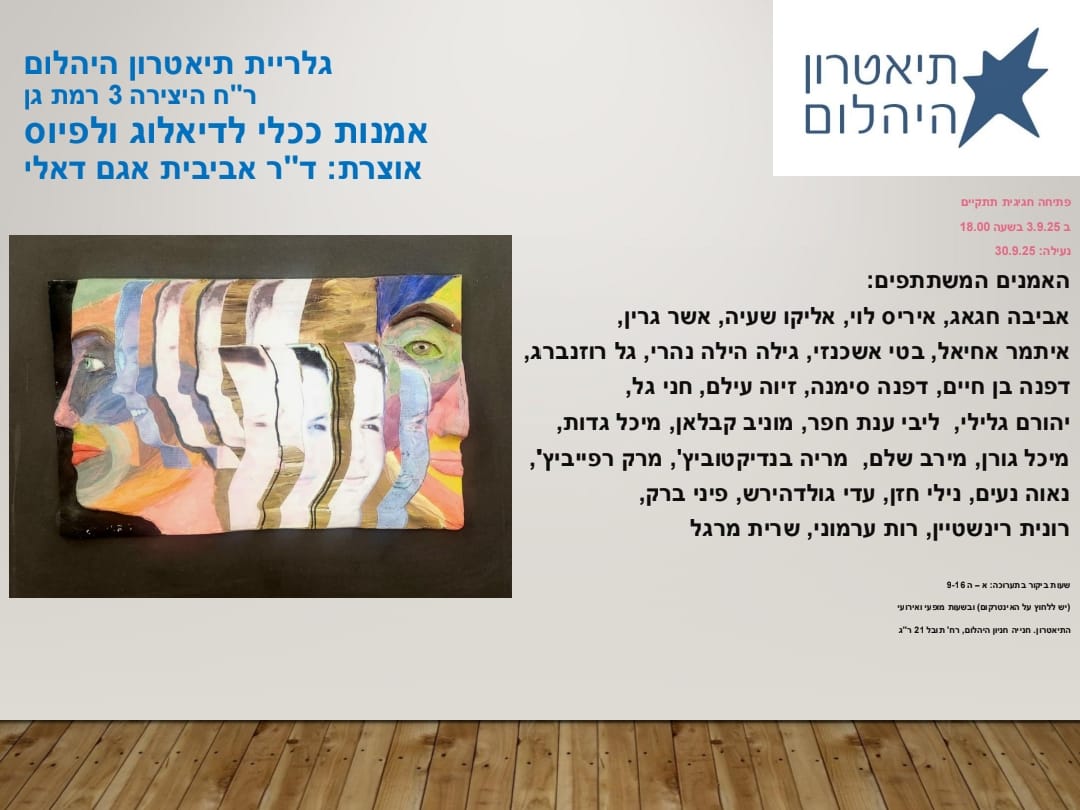 ביום רביעי 3.9.25 בשעה 18:00 תושק בגלריית תיאטרון היהלום ברמת גן התערוכה "אמנות ככלי לדיאלוג ולפיוס". התערוכה בוחנת כיצד יצירות אמנות יכולות לשמש כלי להוצאת