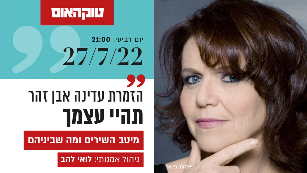 הזמרת והיוצרת עדינה אבן זהר תופיע עם "היי עצמך BE YOURSELF – מיטב השירים ומה שביניהם" ב‏‏יום רביעי 27.7 ‏בשעה ‏‏21:00‏‏‏ במועדון‏ טוקהאוס הממוקם בנמל תל אביב על גדות נחל הירקון