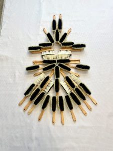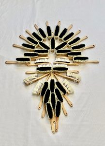 מיצב עשוי מברשות ניקוי אבק, אובייקטים יומיומיים של ניקוי ותחזוקה מכסה את הקיר וגולש לרצפה. מברשת הניקוי, המסירה אבק, משמשת גם ככלי מרכזי בעבודה ארכיאולוגית במהלכה היא חושפת שכבות ומתחקה אחריהן.