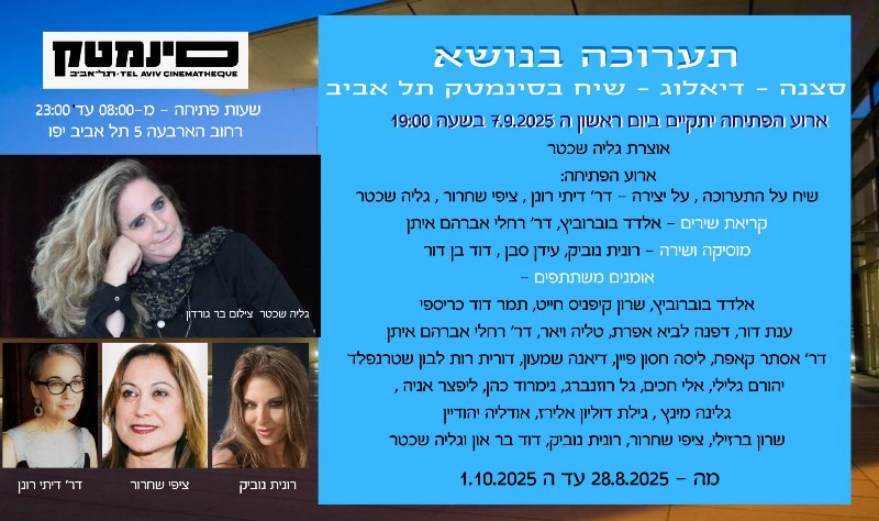 ביום ראשון 7.9.25 בשעה 19:00 תושק התערוכה "סצנה- דיאלוג-שיח" (אוצרת: גליה שכטר) בגלריית הסינמטק תל אביב, הכוללת שילוב של כל המדיות: פסלים, ציורים, צילומים, שירים ודימויים ויזואליים. התערוכה מנסחת מרחב כיחיד ואינדיבידואל, קשורה לממד חברתי בכל תחומי החיים ומותחת קווים לידי שיח ודיאלוג