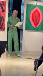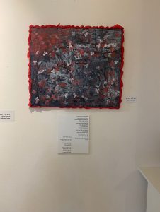 אלה צבעים קוטביים, נוכחים ובוהקים. ואכן האמירה האמנותית בתערוכה לא מסתתרת – סיפורי נשים שעברו טראומות, צעקה עולה מדמות האשה במובנים רבים וברבדים רבים. אלה צבעי קרב וצבעי מסכות. כאוצרת בחרתי נושאים חברתיים פילוסופיים בתערוכה זו, ולאור המצב בארץ החלטתי לאפשר במה לביטוי של רגשות יותר מטלטלים וקשים, ההוויה של כולנו גם עוברת קשיים בפן האישי של כל אחד ובמורכבות שכל אינדיבידואל עובר. בשנתיים-שלוש האחרונות אנו חווים משבר בארץ ובעולם, הכולל שסע. הרחובות והכיכרות מלאים במאות אלפי אנשים שיוצאים למחאות ולהילחם על הארץ הזאת. יש הרבה כאב, פצועים ותמונות קשות. לא כל היצירות בתערוכה הן בעלות אופי קשה, נוקב ומטלטל. יש גם ביטויים ליריים אחרים.