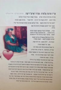 שֵׁרַתִּי בְּלֵב נִשְׁמַת רָקִיעֵי אַדְמַת שִׁירַת אוֹרִין הִלַּת  הָרוּחַ ,בְּנֶפֶשׁ עוֹלָמִי עוֹלָמִים עוֹלָמוֹת נִשְׁמָתִי הַבְּרוּאָה, הַכּוֹרַעַת, הַמֵרוֹקֶדֶת וְהַמְּפַלֶּלֶת טֶבַע אֱלֹהַי חַיִּים וּמַמְחִישָׁה אֶת הַכְּמִיהוֹת שֶׁלִּי לְמַסַּע עוֹלְמוֹת  הָרוּחַ ,הָאַהֲבָה ,הַחְיִין ,הַקֹּדֶשׁ וְהַנִּסְתָּר מֵעָמֹק בְּעֵרַת סַעַר הַתְּשׁוּקָה ,הָאוֹר ,הַכְּאֵב, הַשֶּׁבֶר ,הַבְּדִידוּת ,הַפַּחַד ,הַתִּקְוָה, הַזַּכּוֹת ,הַנָּשִׁיּוֹת הָאִמָּהִיּוֹת וְהַיַּלְדָּה הַנִּצְחִית הַמְּנֻשָּׁמִת בִּי נֶצַח עוֹלָמִים שֶׁל קֹדֶשׁ רָזַי חַיִּים.