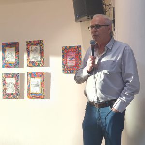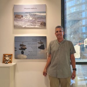 יהורם גלילי ליד השירים והיצירות שלו המוצגות בתערוכה, צילום: ד"ר רחלי אברהם איתן