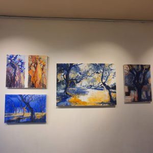 המשוררת והסופרת ד"ר רחלי אברהם איתן, עורכת כתב העת הספרותי "שבילים", מחפשת בשירה "אצטרובלים" את האוצרות באמירי העץ וגם בונה תמונת טבע. הפסיכולוג הקליני ד"ר ניר סופר דודק מציג טקסט ותמונת טבע מלאה הוד והדר הטבע האוניברסלי הקוסמי – תמונת שקיעה בצבעים זרחניים מלאי אודם. ד"ר אסתר קאפח, סופרת משוררת וחוקרת ישראלית רב-תחומית בתחום החינוך, מציגה את פירות הטבע, היופי הקסם והבשלות. ציוריה של האומנית רונית זילברמן מציגים את הכחול השופע, את חקירת העץ ופארותיו ואת צמיחתו חקירה בלתי מתפרשת המגלה את מאבקי הצמיחה. היצירה שלה מתכתבת עם הצייר מונדריאן שיצא לטבע וצייר עצים – מפיגורטיבי ועד למופשט שאליו הגיע.