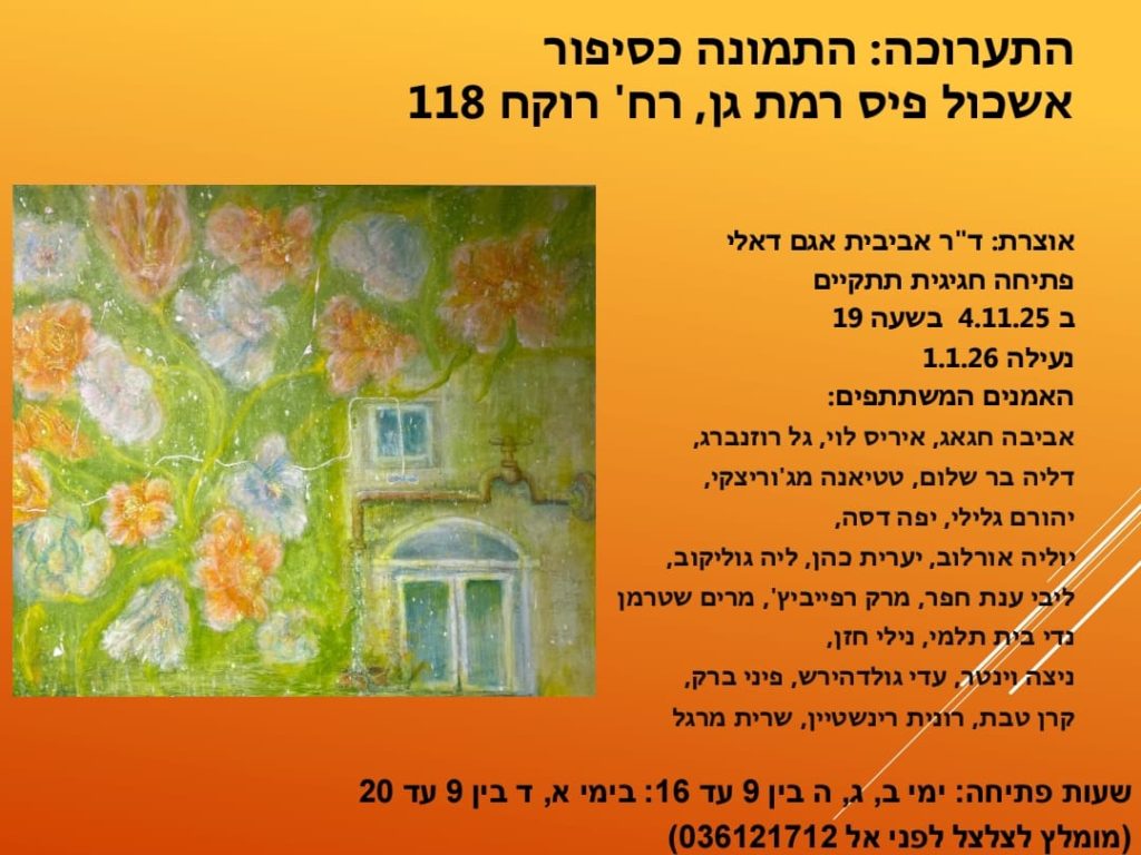 בחלל היפה שבאשכול פיס רמת גן תיפתח ביום שלישי 4.11.25 בשעה 19:00 התערוכה "התמונה כסיפור" (אוצרת: ד"ר אביבית אגם דאלי), שתוצג בנובמבר-דצמבר. התערוכה מבקשת לברר באמצעות יצירות של 21 אמניות ואמנים האם תמונה יכולה לשאת משמעות מעבר לעצמה