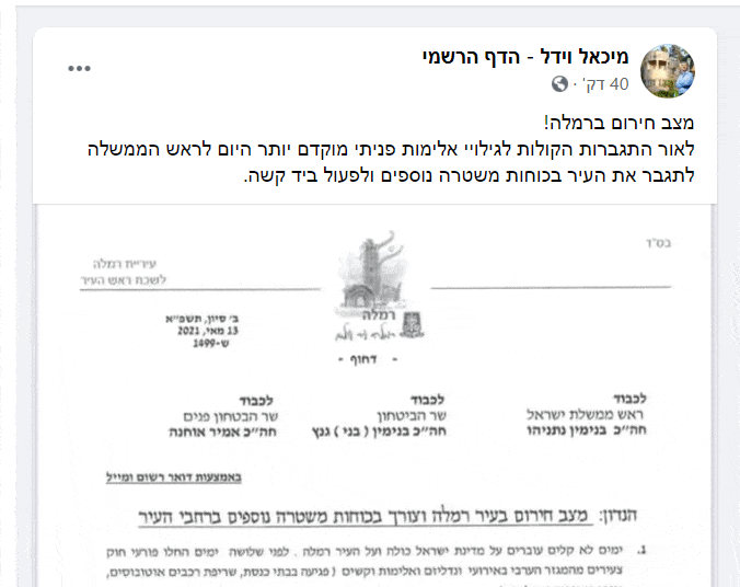 מיכאל וידל, ראש עיריית רמלה קורא לממשלה להגן על תושבי עירו מפני פוגרום שמתכננים ערבים לבצע.