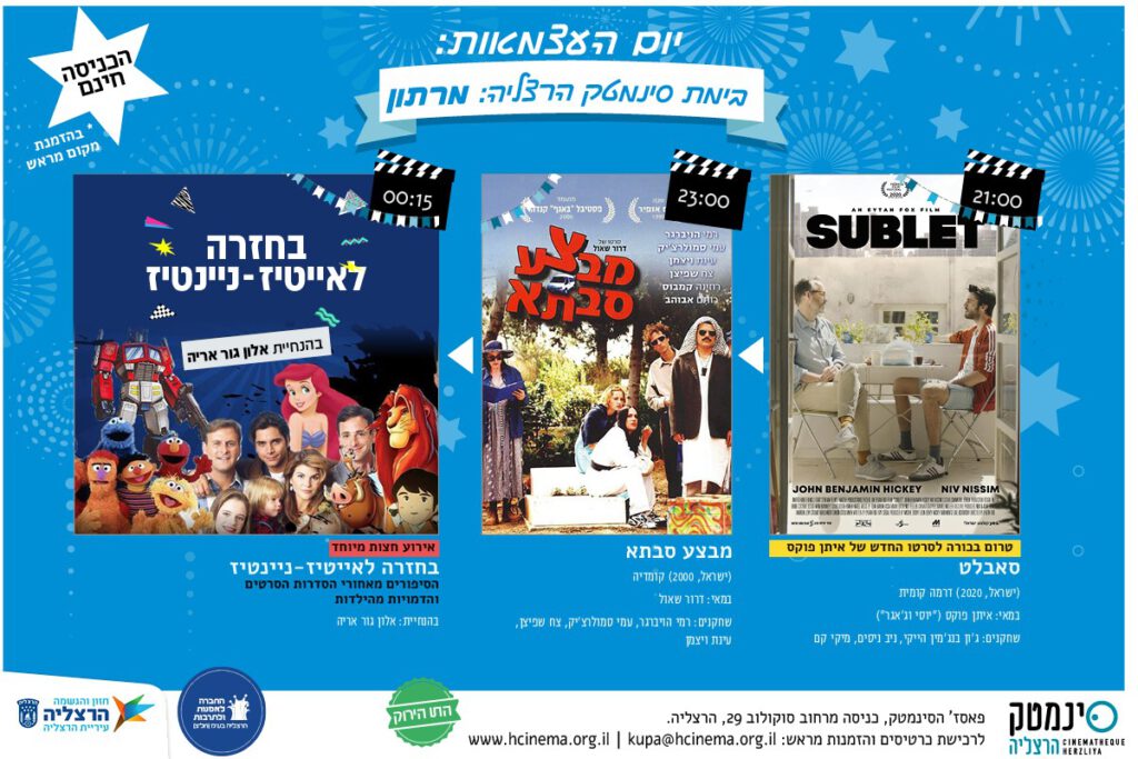 סינמטק הרצליה יקיים בערב יום העצמאות 14.4 ערב הקרנות סרטים ישראליים, שיהיה פתוח לקהל הרחב. מותנה בהרשמה מראש באתר הסינמטק, לפי הנחיות התו הירוק.