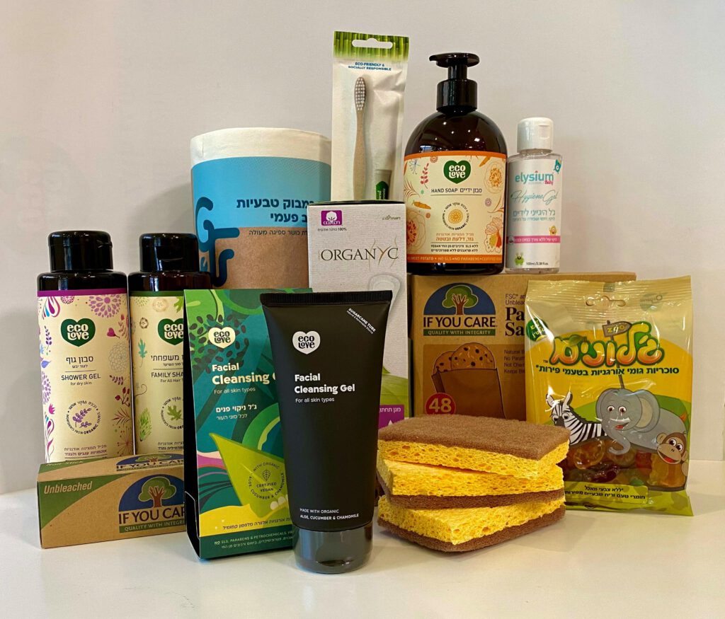 המארז שיוצע במחיר מיוחד כולל 12 מוצרי מזון, טיפוח, היגיינה ומוצרים לבית כמו: מארז מברשת שיניים – מעמילן תירס + משחת שיניים מנטה, מגן תחתון 100% כותנה אורגנית, אלכוג׳ל – לניקוי חיטוי ושמירה על היגיינת הידיים , נייר אפייה אקולוגי, שקיות אוכל אקולוגיות מנייר, מטליות למטבח במבוק טבעיות לשימוש רב פעמי, ספוג לשטיפת כלים מסיבים ממוחזרים וקליפות אגוזי מלך וסוכריות גומי אורגניות וטבעוניות.